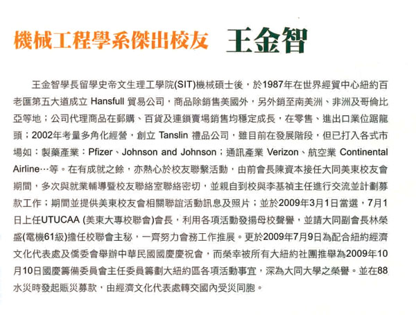 機械系62級王金智(美國Hansfull Trading Co.,Inc.董事長)